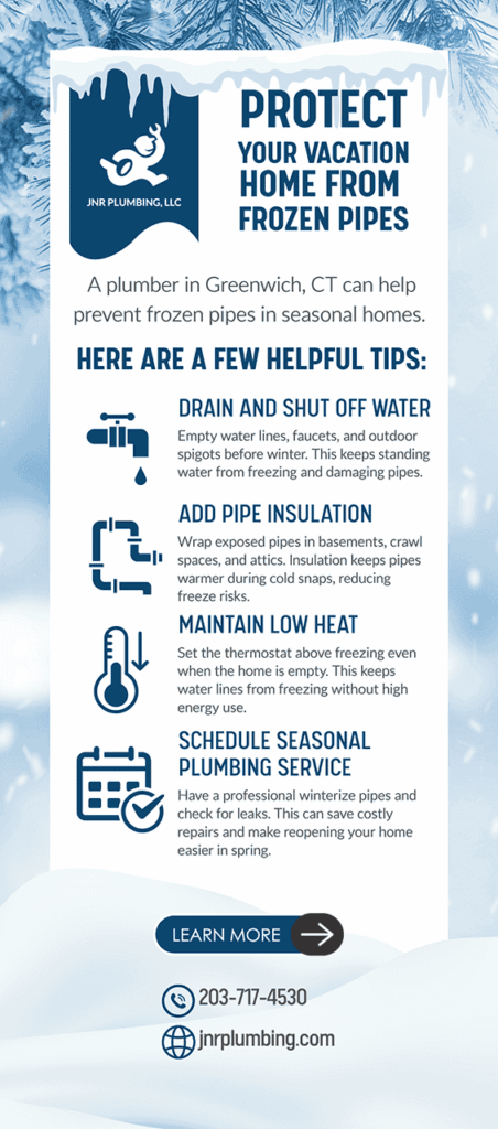 Seasonal homes require a different kind of care, especially during colder months when no one is there to watch over them. Frozen pipes are one of the biggest risks for properties that sit vacant for long stretches of time. JNR Plumbing shares practical steps that help keep water lines safe before temperatures drop, advice drawn from years of serving homeowners as a trusted plumber in Greenwich, CT.